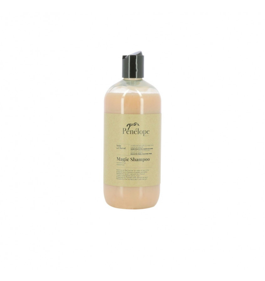 Pénélope „Magiczny szampon” dla koni czyści i nabłyszcza sierść. Odpowiedni dla koni o wrażliwej skórze, szanuje naturalne pH skóry. Formuła bez siarczanów i na bazie hydrolizowanych białek jedwabiu. Szampon pochodzenia naturalnego, bez GMO, wyprodukowane we Francji, bez siarczanów i bez silikonu. Zawiera delikatne drobinki połyskujące. Piękny zapach.