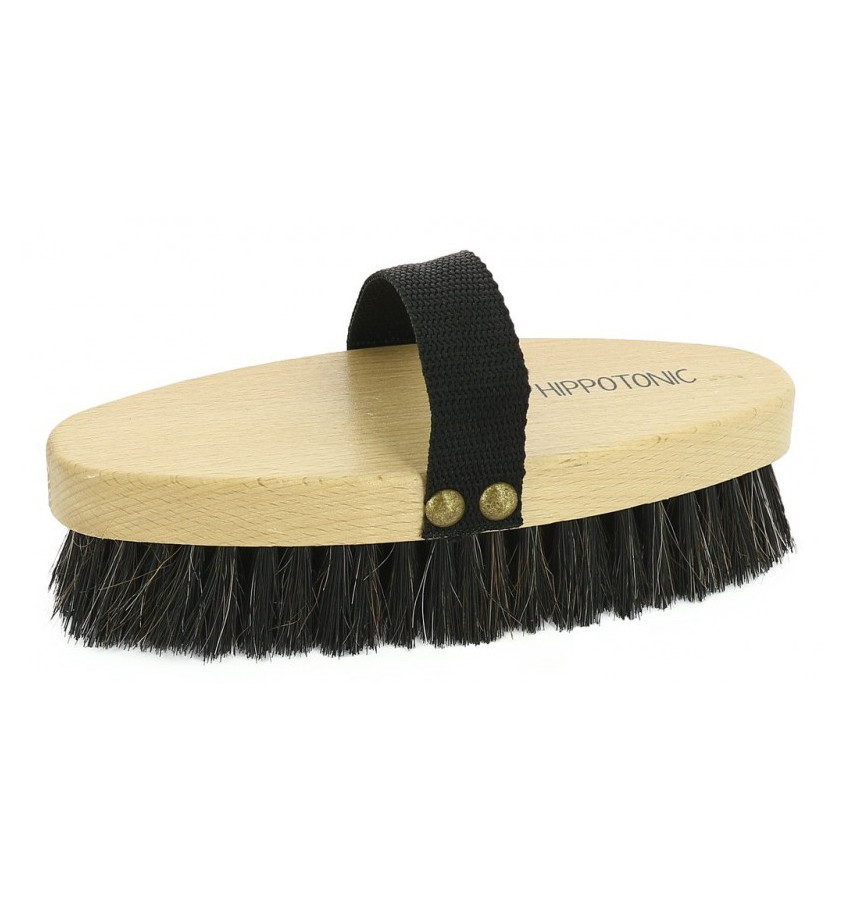 Szczotka Hippotonic Crins wykonana z wysokiej jakości miękkiego włosia. Grzbiet szczotki wykonany z lakierowanego drewna bukowego. Posiada czarny polipropylenowy pasek z niklowanymi mosiężnymi nitami.