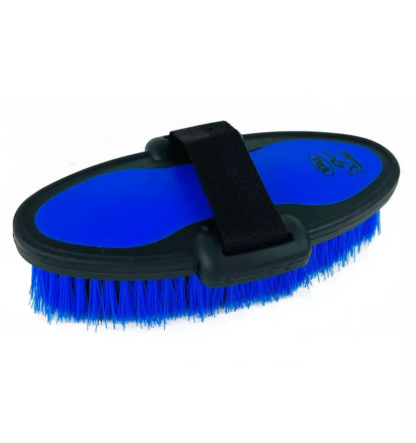 Szczotka do sierści z paskiem na dłoń. Gęste, syntetyczne włosie doskonale zbiera kurz z końskiej sierści.