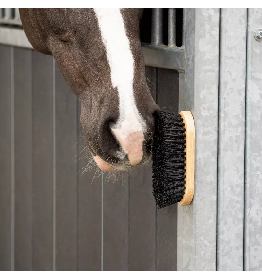 Twarda szczotka z solidną drewnianą rączką. Szczotka nadaje się do spulchniania zabrudzeń. W rączce znajduje się magnes, dzięki któremu z łatwością przyczepisz ją do krat boksu lub paki.