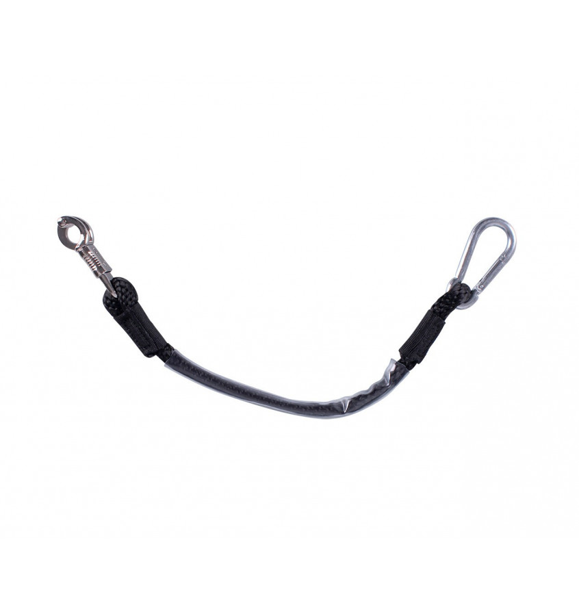 Uwiąz stajenny z gumową osłonką. Może być używany w koniowozie. Wyposażony w bezpieczny karabińczyk w celu szybszego odpięcia konia.