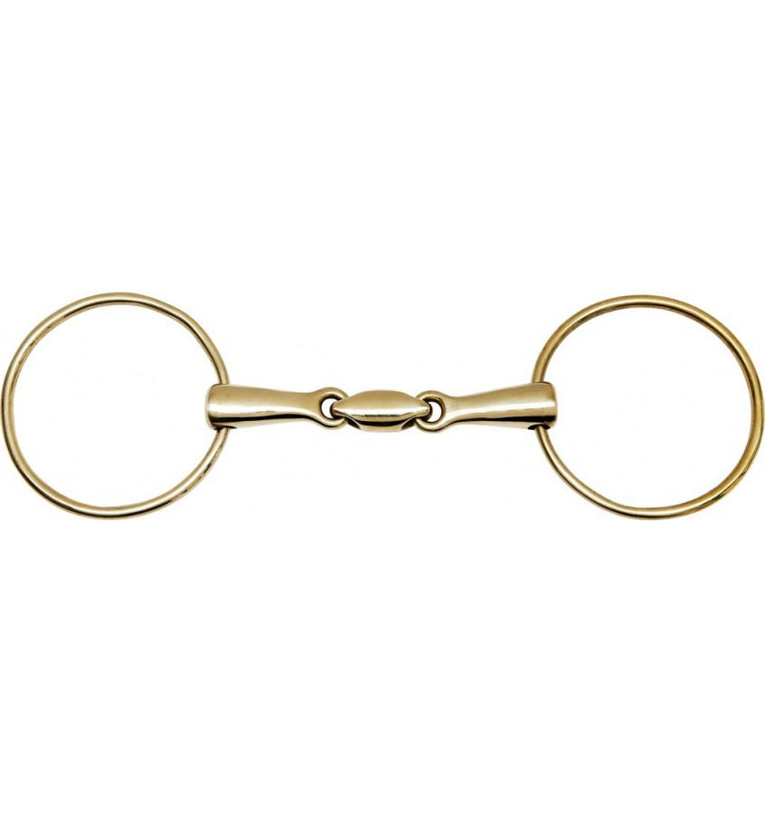 Wędzidło wykonane ze srebra niemieckiego w kolorze złotym. Podwójnie łamane, pełne. Anatomiczny kształt i eliptyczny łącznik delikatnie oddziałują na pysk. Grubość 21mm