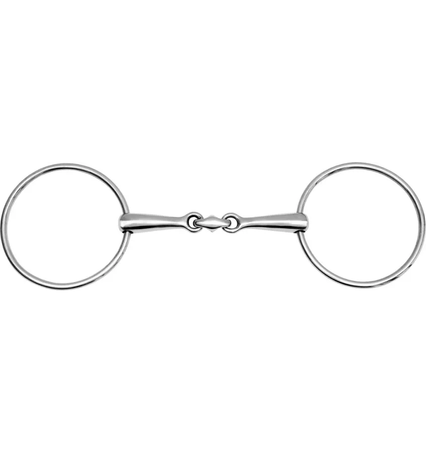 Wędzidło z dużymi kółkami wykonane ze stali nierdzewnej. Podwójnie łamane, pełne. Anatomiczny kształt i eliptyczny łącznik delikatnie oddziałują na pysk. Grubość 16mm