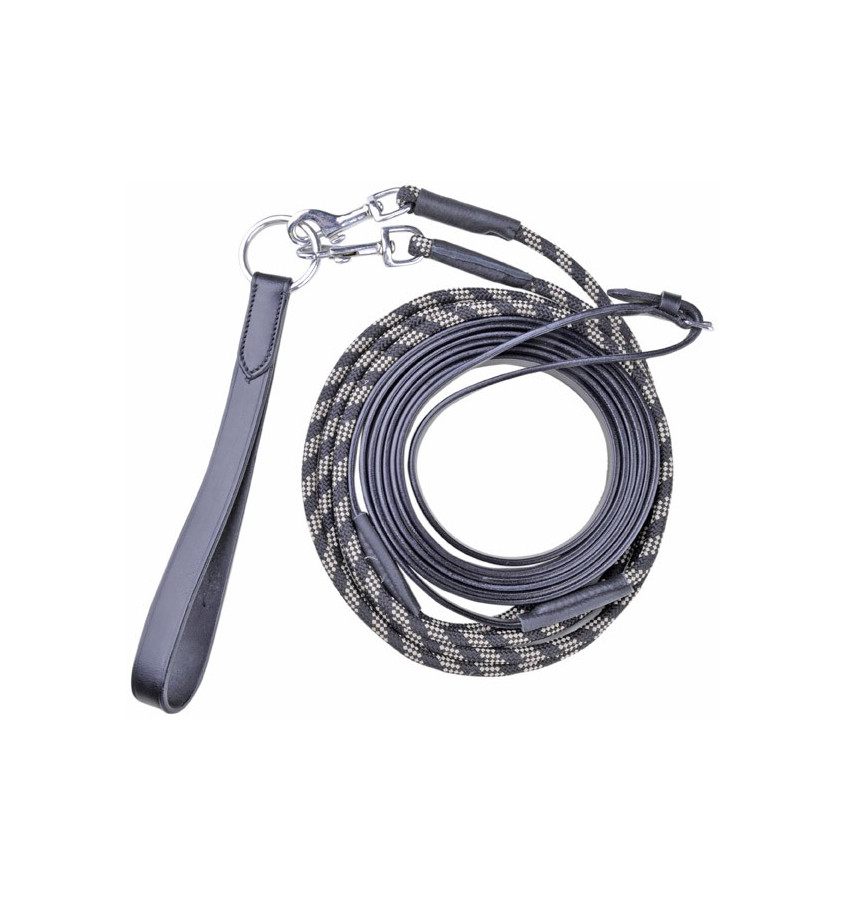 Czarna wodza wykonana z połączenia wodzy skórzanej oraz sznurka ułatwiającego przesuwanie się w kółku wędzidłowym. Posiada klasyczne, stabilne, srebrne karabińczyki oraz mocowanie do popręgu.