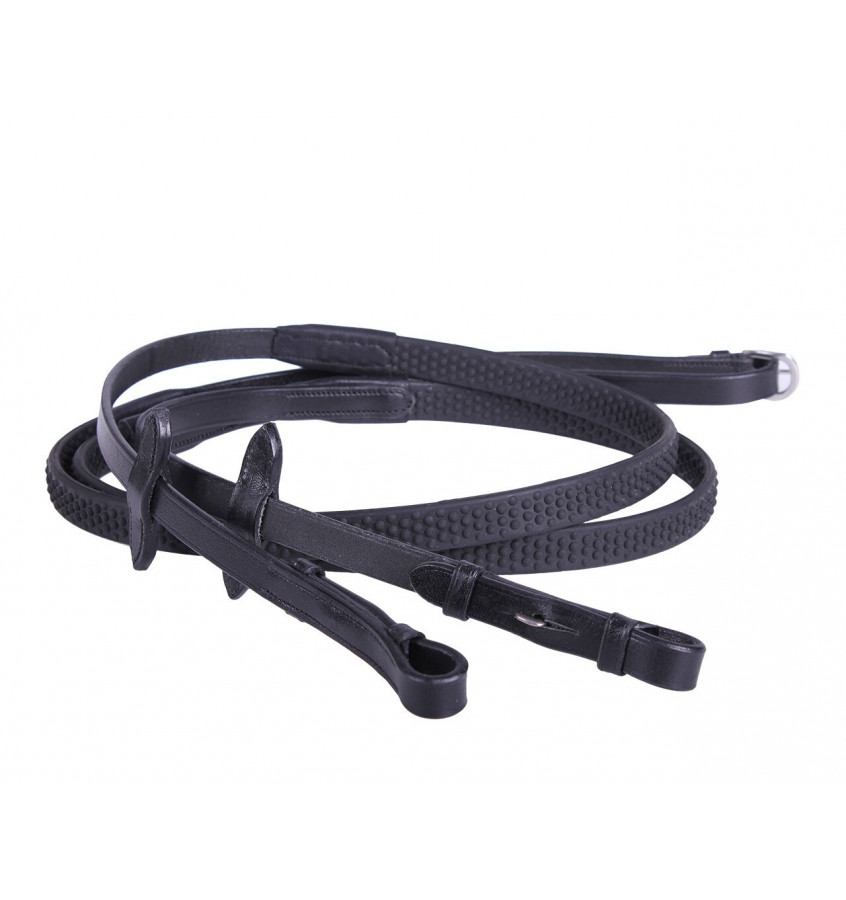 Wodze antypoślizgowe zapinane do wędzidła na haczyki. Wykonane z miękkiej gumy z wypustkami, która jest miękka i dobrze układa się w dłoniach. Okucia ze stali nierdzewnej. Pozostałe elementy wykonane ze skóry.