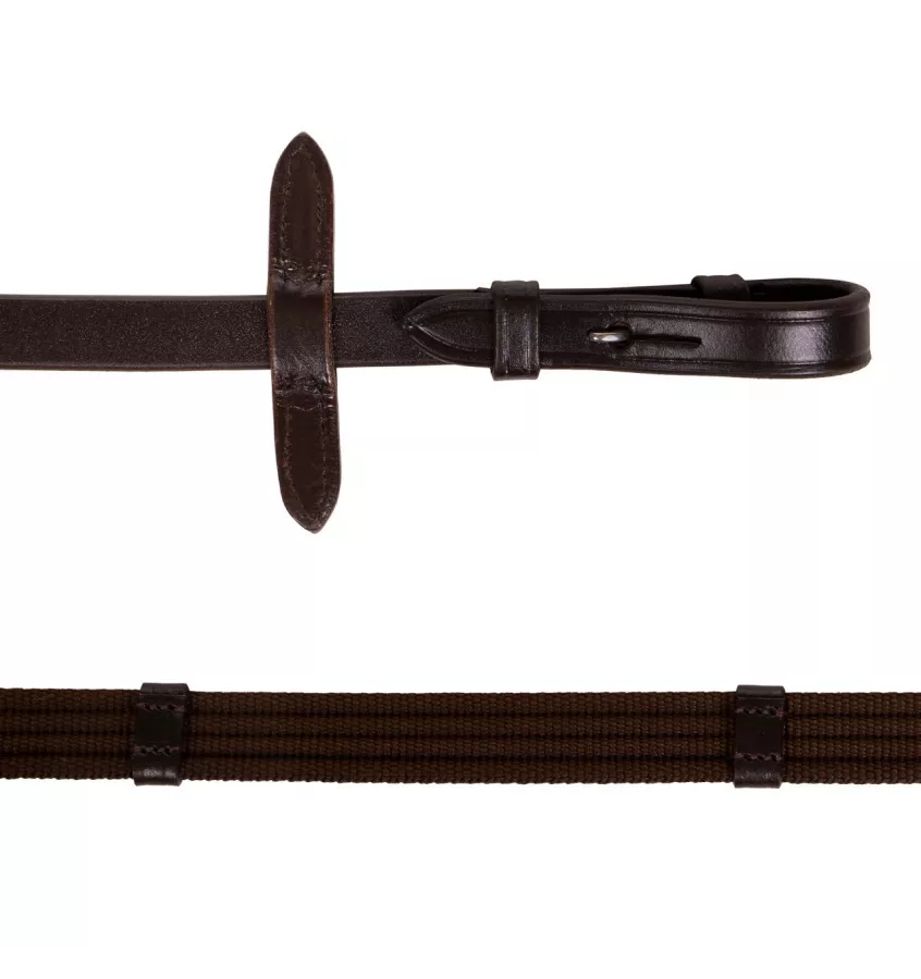 Wodze parciane z zapięciem na haki przy wędzidle. Łączone ze sobą za pomocą rzepa. Wykończenia skórzane. Ze stoperami.