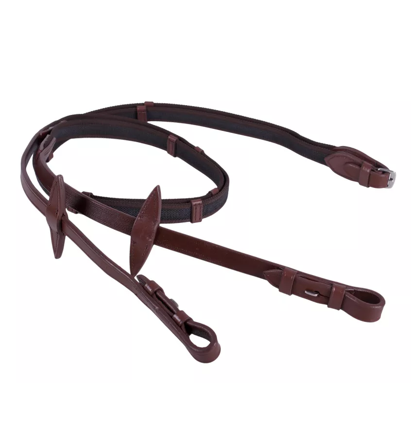 Te wodze mają przeplatany wzór gumy na całej długości, co zapewnia dobry chwyt. Wykończone skórą i wyposażone w stopery.
