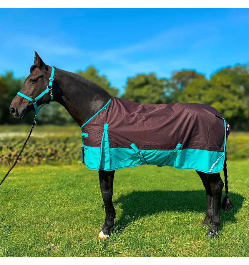 Derka padokowa z lekkim 50 g wypełnieniem. Doskonała na chłodniejsze lub deszczowe dni poza stajnią. Regulowane, elastyczne pasy przy tylnych nogach i pod brzuchem stabilizują derkę. Posiada sprzączki do podpięcia kaptura, klapę na ogon oraz miękkie wykończenie w okolicy kłębu, które zapobiega otarciom. Nie krępuje ruchów, a odblaskowe aplikacje poprawiają widoczność. Kolor brązowo-turkusowy