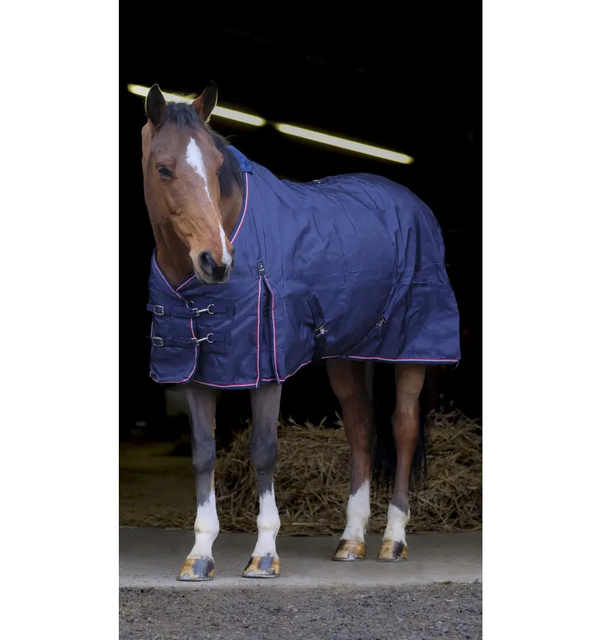 Derka stajenna wykonana z wytrzymałego materiału polipropylenowego 840D z podszewką z polibawełny. Wypełniona polyfilem 50g. Wyposażona w pasy krzyżowe, paski między nogii pasek pod ogon. Łatwe zapięcie na klatce piersiowej za pomocą podwójnego paska i szybkie zapięcie za pomocą karabińczyków z dwoma opcjami mocowania.