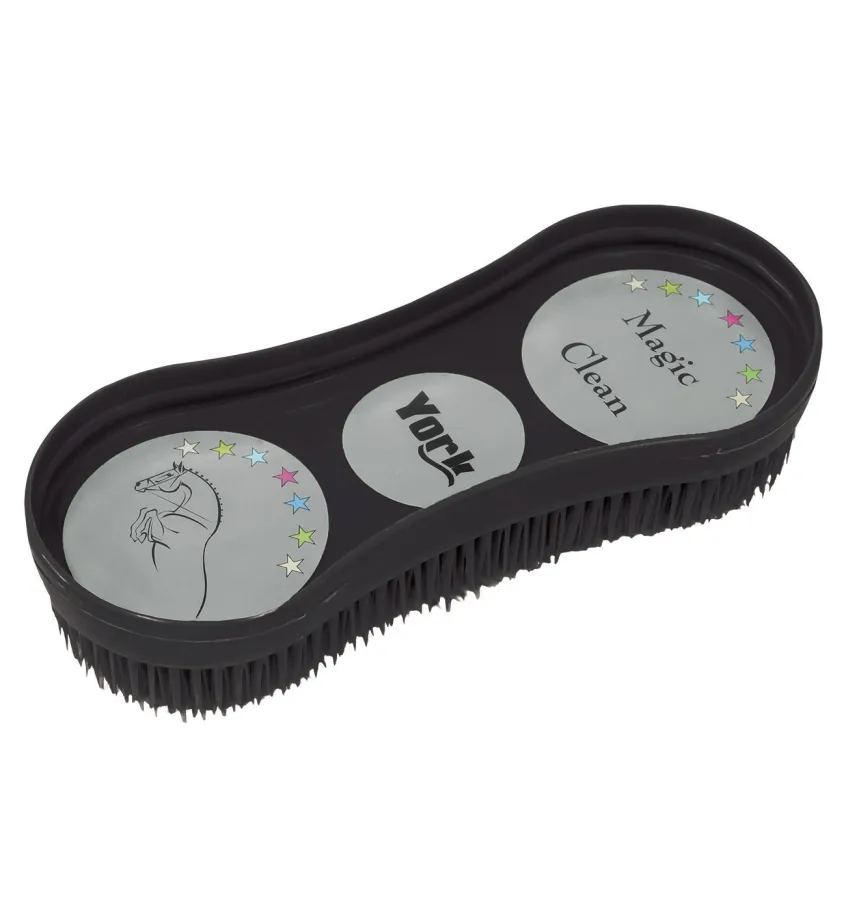 Magiczna plastikowa szczotka zaopatrzona w długie plastikowe włosie. Górna część może służyć jako ściągaczka do wody. Nie podrażnia delikatnych miejsc, takich jak na przykład stawy konia. Doskonale nadaje się do masowania konia