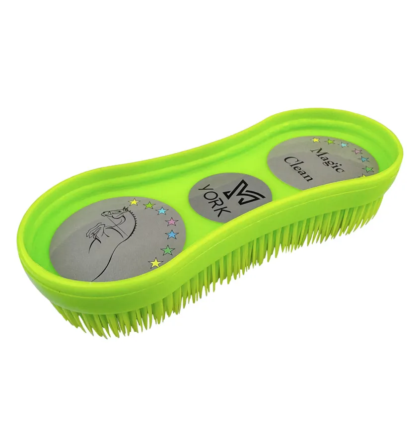 Magiczna plastikowa szczotka zaopatrzona w długie plastikowe włosie. Górna część może służyć jako ściągaczka do wody. Nie podrażnia delikatnych miejsc, takich jak na przykład stawy konia. Doskonale nadaje się do masowania konia
