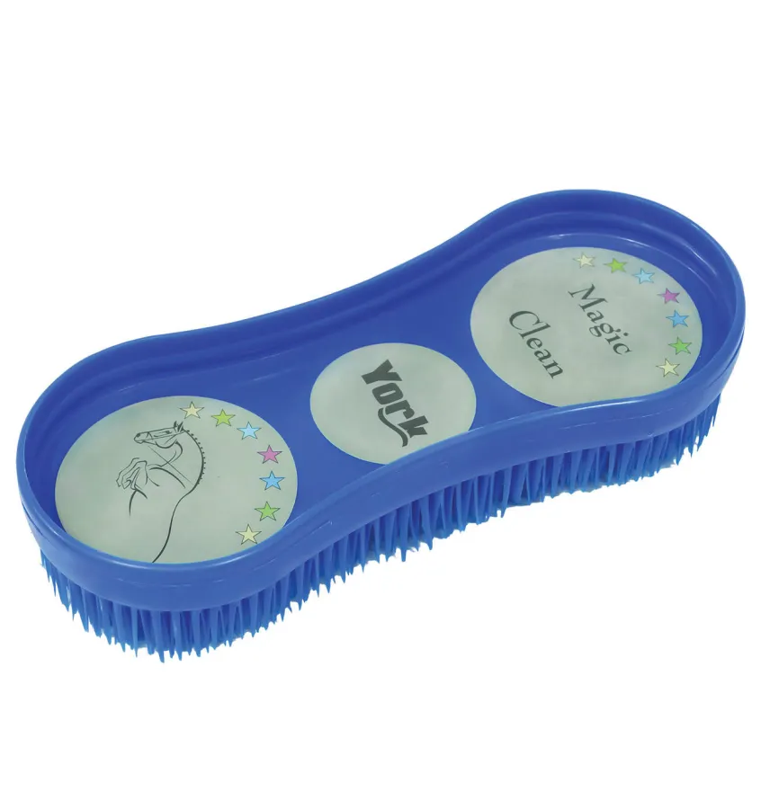 Magiczna plastikowa szczotka zaopatrzona w długie plastikowe włosie. Górna część może służyć jako ściągaczka do wody. Nie podrażnia delikatnych miejsc, takich jak na przykład stawy konia. Doskonale nadaje się do masowania konia