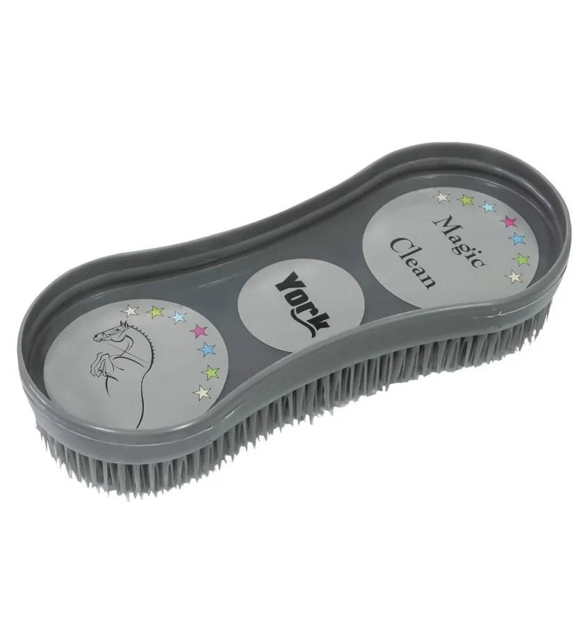 Magiczna plastikowa szczotka zaopatrzona w długie plastikowe włosie. Górna część może służyć jako ściągaczka do wody. Nie podrażnia delikatnych miejsc, takich jak na przykład stawy konia. Doskonale nadaje się do masowania konia