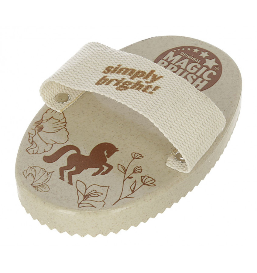 Zgrzebło wykonane z tworzyw sztucznych pochodzących z recyklingu. Szlufka wykonana w 100% z bawełny. Dobrze usunie brud z końskiej sierści.