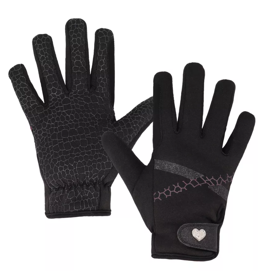 Rękawiczki jeździeckie Lize charakteryzują się pięknym nadrukiem na wierzchu. Zapewnia dobrą przyczepność dzięki materiałowi na wnętrzu dłoni. Zapięcie na rzep zdobi brokat. Rękawiczka jest wzmocniona między palcem serdecznym a małym oraz między palcem wskazującym a kciukiem.