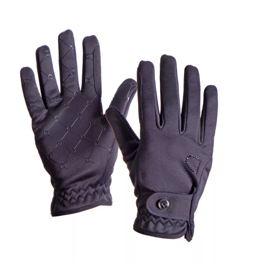 Te rękawiczki jeździeckie zapewnią ciepło zimą, a dodatkowo będziesz wyglądać elegancko i stylowo. Rękawiczki są podszyte polarem, a tkanina zewnętrzna wykonana z materiału softshell jest wodoodporna i oddychająca. Od wewnętrznej strony zastosowano silikonowy nadruk z pięknym wzorem, który zapewnia pewny chwyt wodzy. Na grzbiecie dłoni znajduje się zdobienie z kryształków we wzór strzemienia.